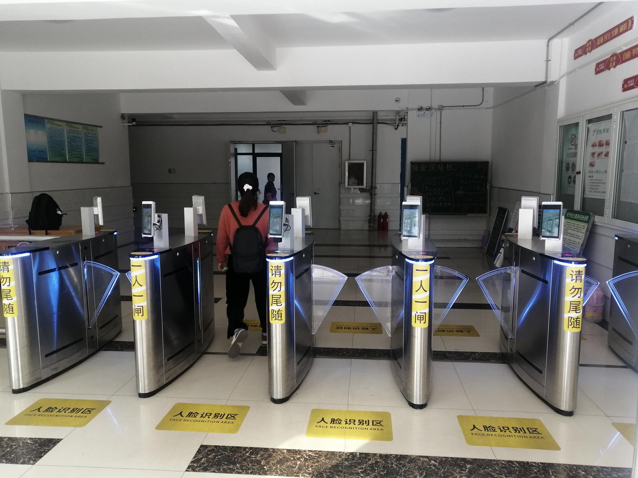 案例详情:在信阳学院学生宿舍出入口部署人脸识别+测温系统,学生进出时进行刷脸并无感测温,刷脸成功且温度无异常时通道打开,允许通行。非本栋注册人员或者温度异常,则通道不打开,人员无法进入宿舍楼。