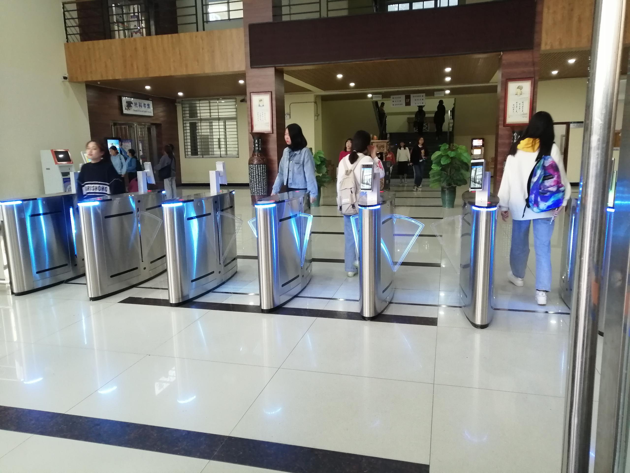 案例详情:在信阳学院图书馆出入口部署人脸识别+测温系统,学生进出时进行刷脸并无感测温,刷脸成功且温度无异常时通道打开,允许通行。非本校注册人员或者温度异常,则通道不打开,做到事前防控,事后及时处理。