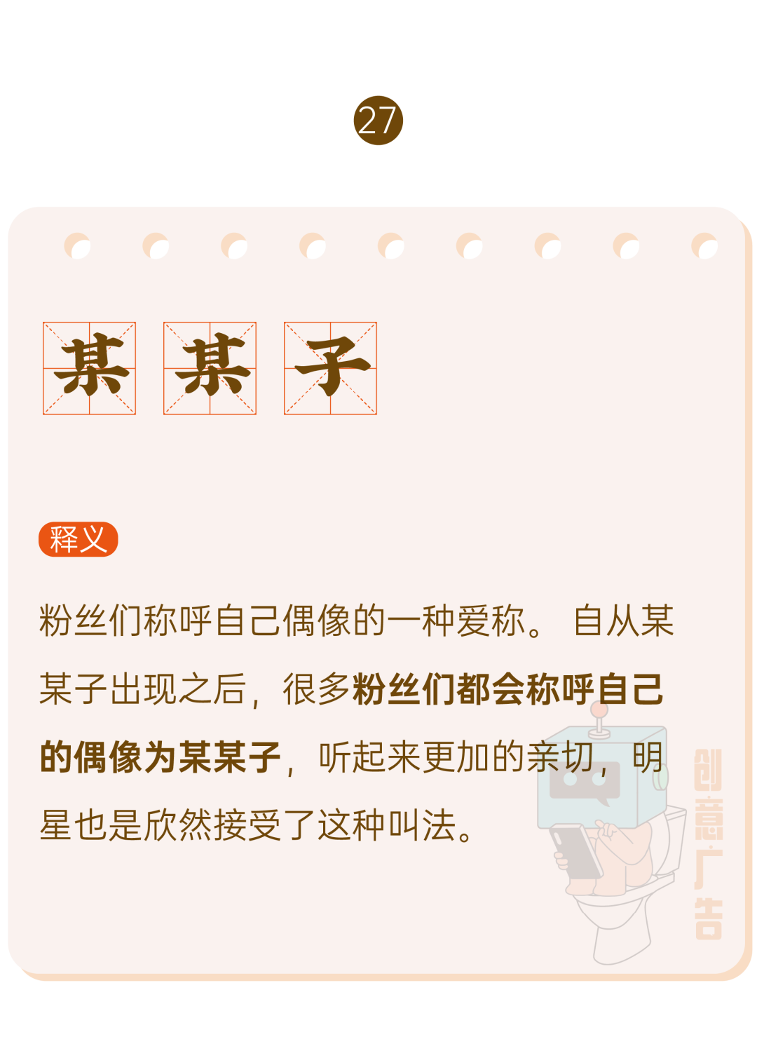 01含义:取名字中的某一个字重复一次后以“子”结尾,是粉丝对爱豆的爱称。