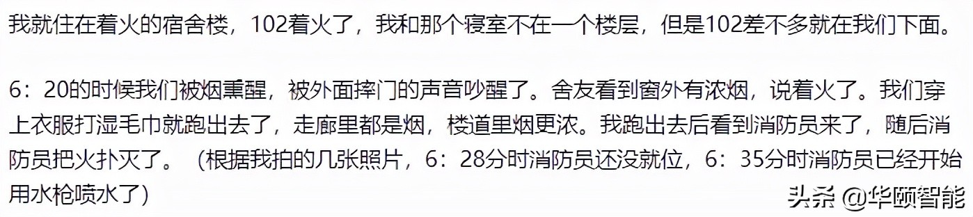 部分学生表示,火灾发生的时间点,基本在早上6:19分左右,发现火情后,消防人员到达现场展开救火工作的时间是6:35分,这期间多数发现火情的学生,大部分都是发现浓烟后,才开始从宿舍撤离。