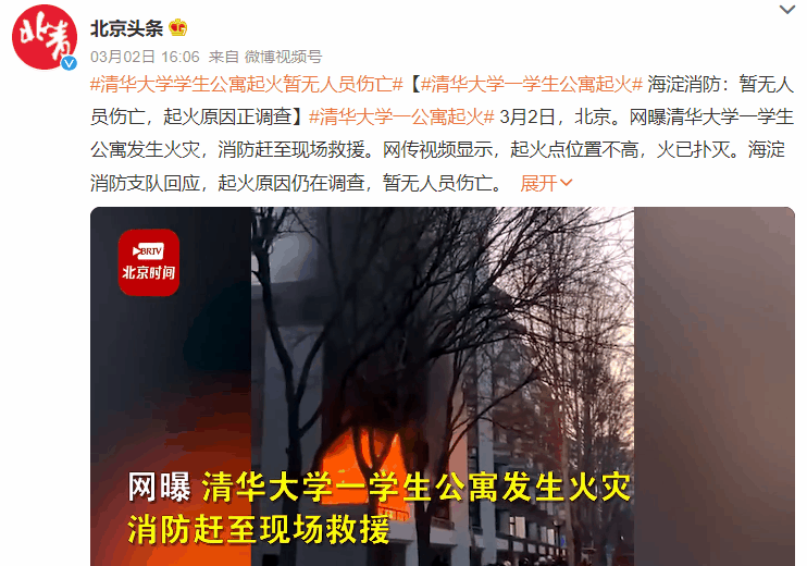 3月2日,有微博网友爆料称清华大学紫荆学生公寓发生火灾。经清华大学学生公寓管理处了解,确有火灾发生,未有学生受伤,目前火已经被扑灭,具体细节还不清楚,学校正在处理。