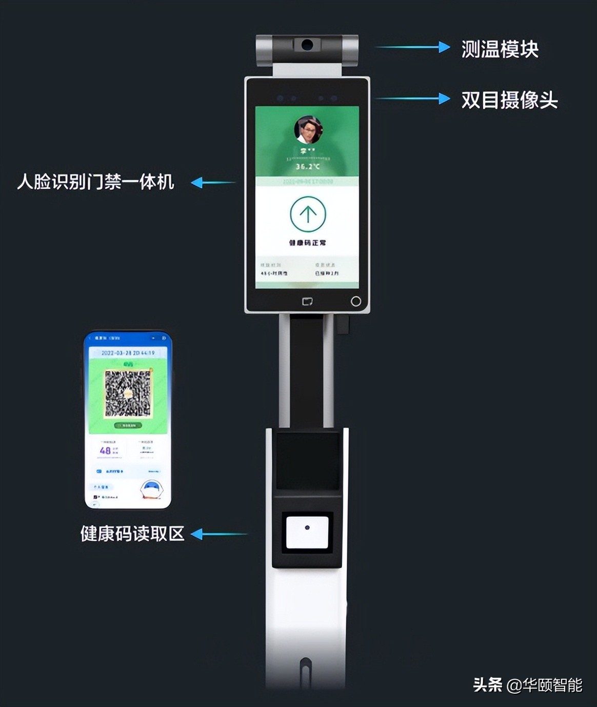 当人员经过门禁通道时,系统人脸识别、智能测温和健康码核验同时启动,有通行权限的人员只需要“刷脸/身份证/健康码”,即可同步实现人员身份核验与测温,全程“无接触式”正常通行!