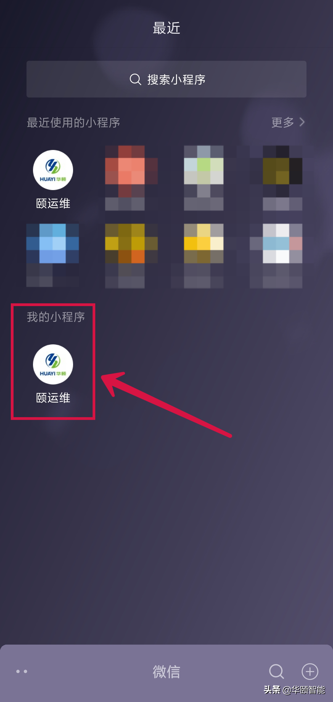 2、小程序还可以设置添加到微信“我的小程序”,日后使用时,可以直接下拉微信搜索栏,在我的小程序界面直接进入“颐运维”。